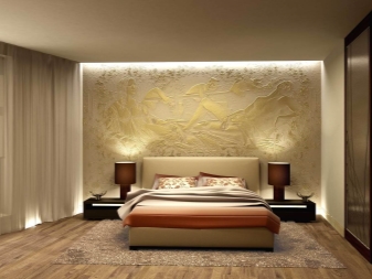 - Гипс. Един от най -ефективните варианти. С тази текстура можете лесно да създадете имитация на фреска. Това ще ви помогне да създадете интересни акценти в стаята и да й придадете нотка на античност, грация и кралски особи. Предимството на този тип е, че прахът практически не се натрупва в тази структура, а почистването е много лесно..