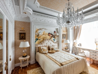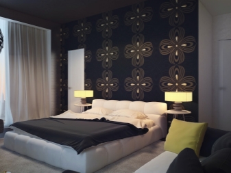 Използването на фототапет с монограми ще ви помогне да създадете истинска театрална зала в спалнята, а ако изберете бордо, синьо или изумрудено със златни декорации и в същото време дадете предпочитание на тапети от плат, можете да получите истински дворец.