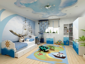 За момче можете да създадете истинска пиратска стая с изображения на морски битки, морска повърхност, котви и различни пиратски трикове.