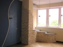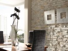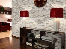 - Пример за дизайна на дял, който започна да изглежда по -мощен, впечатляващ и текстуриран. Изкуствените цветя оживяват грубия каменен декор. Можете да видите, че останалите стени са доста скромно облепени с тъмно бежов тапет, така че декоративната преграда се превръща в интериорен акцент. В тази версия би било хубаво да поставите снимки или картини на този дял..