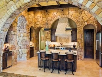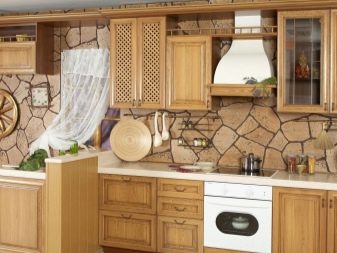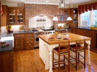 Кънтри стил е лесен за създаване с тухлен или жълт изкуствен камък. Простотата на интериора обаче ще покрие високата му цена. За такова покритие също ще трябва да създадете имитация на дъска, използвайки керамика или ламинат. Следователно това решение е неикономично за целия периметър най -добрият вариант би бил да поставите част от стената с декоративни плочки, а останалата част от периметъра с декоративна мазилка или тапет.