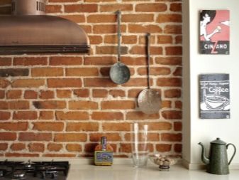 - Красива декоративна тухла може да се използва в декорацията на стените на кухнята, ако има груби елементи, като аспиратор. Тухлата изглежда естествено, всички предмети върху нея изглеждат по -обемни.