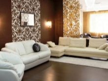 Двуцветните решения могат да изсветлят дребни недостатъци. Ако в хола има незабележими ниши или первази, тогава дизайнерите препоръчват да ги оформите с тъмни тапети, а останалата част от стаята със светлина.