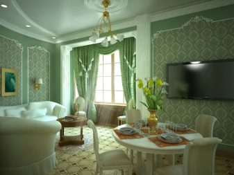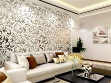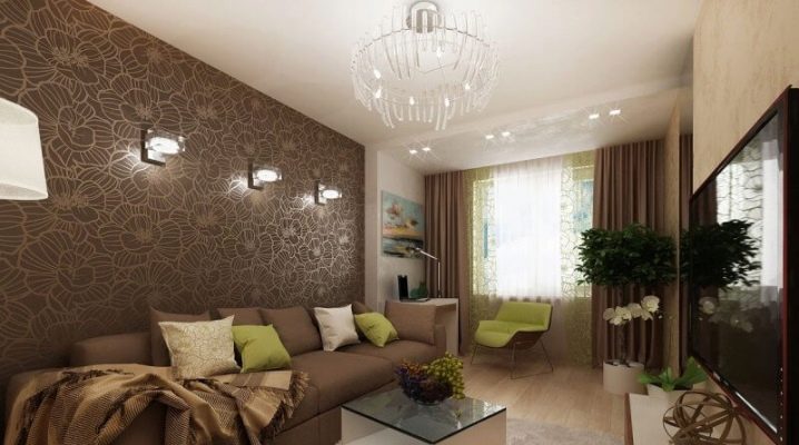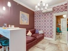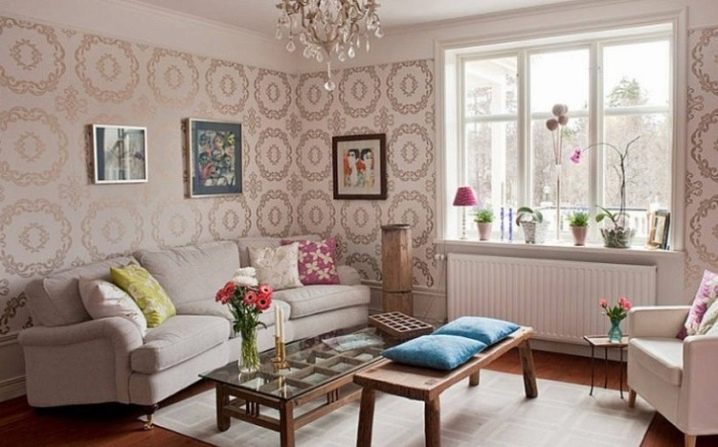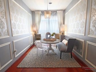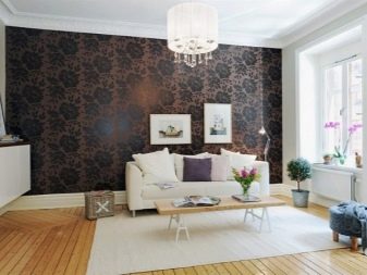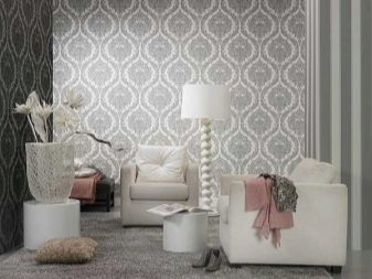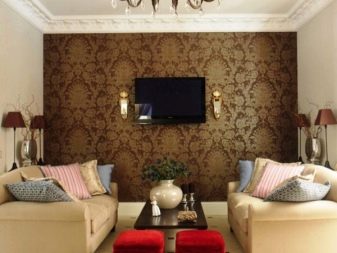 Комбинирането на обикновен тапет с и без модел в хола ви позволява да победите дори малка стая. Моделите, орнаментите и монограмите помагат да се трансформира една от стените, да я отличат от останалите.