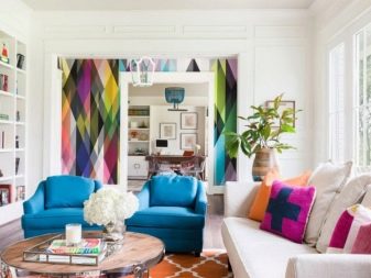 В тясна стая трябва да се даде предимство на ярки цветове при акцентиране на малки площи и да се подчертаят дългите със спокойни нюанси. Тази техника ви позволява да разширите пространството на хола. Дизайнерите знаят отлично, че комбинирайки студени и топли нюанси, можете да постигнете желания резултат..