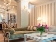 Играейки с различни тапети с една и съща цветова схема, можете да създадете уникален интериор, който да съчетава тържественост, простота и динамика. Специални рафтове и огледала ще ви помогнат да се съсредоточите върху ивиците..