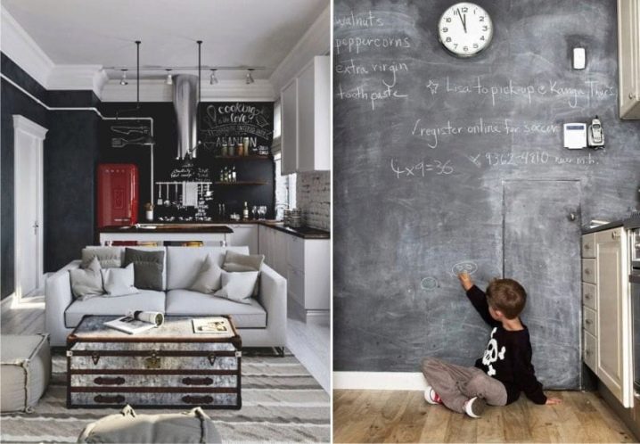 Ако малките деца използват хола като зона за игра, тогава трябва да намерите малък ъгъл за тази цел и да залепите креда тапет там – можете да рисувате върху тях. Грижата за тях е лесна – просто избършете с кърпа.