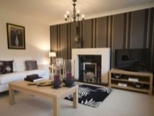 Комбинацията ви позволява да победите стаята в минималистичен стил. Цялото внимание се обръща на стената, която е залепена по този начин. Акцентът помага да се посочи зоната на камината или стената, на която виси телевизорът.