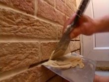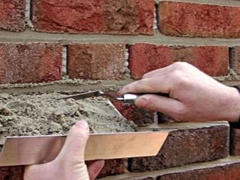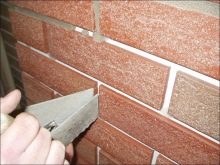 Този метод се използва при работа с портланд цимент, който трябва само леко да се разрежда с вода и да се разбърква добре. За да работите, трябва да закупите фурнир за зидар, който съответства на ширината на шева на Вашата зидария. В този случай минималната дълбочина на шева трябва да бъде 5 мм.. Ето как изглежда напредъкът в работата с този метод за нанасяне на фугираща смес: