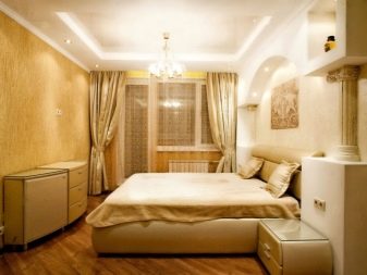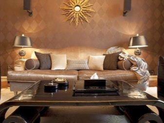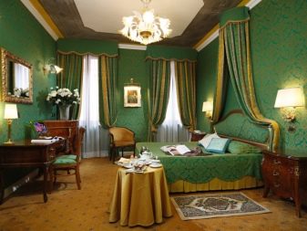 Стените, декорирани „в злато“, не губят своята актуалност и днес. Това е особено вярно в големи стаи или просторни зали. Червено злато, помпозно тъмно зелено, класическо бяло – това изисква големи площи. В малките стаи тези цветове могат визуално да намалят пространството или да го затрупат. В спалните стените от злато ще изглеждат добре под формата на панел над таблата, а останалите стени могат да бъдат светли цветове – бяло, пясъчно, бежово, светло зелено.