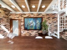 - Просторна стая с тухлена зидария в естествен червен цвят. Поддържа тона на пода и е в пълна хармония с пространството.