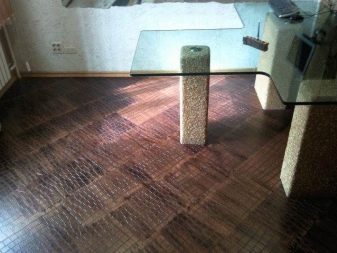 Като подово покритие, двуслойните модели се правят с основа от порцеланови каменни изделия или керамични плочки.. Като основа се използват и плътни дървесни материали. Долният слой осигурява здравина и твърдост на покритието. Ако горният слой е направен от естествена кожа, тогава производителите го импрегнират със специален състав, който подобрява здравината на покритието. Изработен е слой от изкуствена кожа с дебелина най -малко три милиметра.