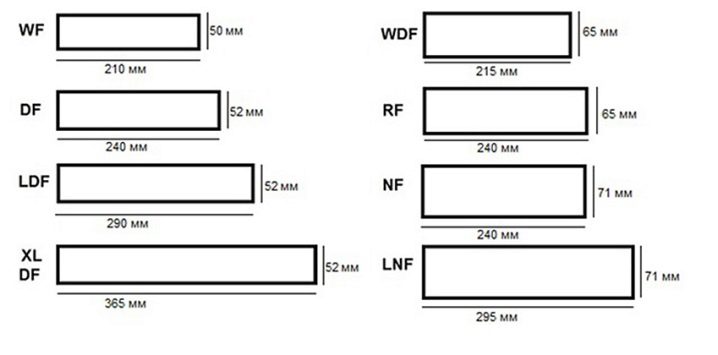 Има и друга класификация, при която продуктите имат еднаква дължина – 240 и дебелина от 9 до 17 мм и се различават само по ширина: