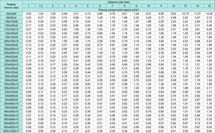 Таблицата показва стойностите, изчислени с помощта на всички необходими показатели, отразени във формулата. Например, трябва да изчислите разхода на фугираща смес на 1 m² за плочка с размери 50×50 mm, дебелина 4 mm, с ширина на фугата 1 mm между плочките. Разходът на фуга ще бъде (50 + 50) / (50×50) x4x1.4×1 + 10% = 0.246 = 0.25kg / m². По този начин се прави приблизително изчисление на разхода на фугираща смес на 1 м² плочки. Ако не вземете предвид допълнителния обем на сместа, тогава скоростта се определя от средния коефициент на плътност.