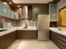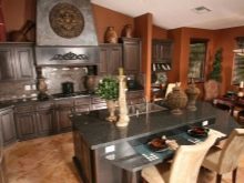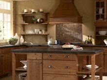 - Доста рядко богати шоколадови цветове могат да бъдат намерени в дизайна на стените на кухнята. Обикновено имат приглушен тон и най -често присъстват само в една част от стената. За тази зона се избират модели с шарка, която извежда цветовете, в които е въплътена останалата част от кухнята..