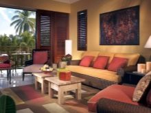 - За посоката на минимализма и ориенталските концепции комбинация от кафяво с жълти и оранжеви нюанси ще бъде идеална. Непроницаемите теракотени шарки ще изглеждат перфектно не само при нормално, но и при цветно осветление.