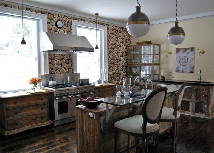 - Подобен дизайн може да присъства в селския стил, но освен дърво, често можете да намерите тапети, имитиращи дървена зидария. За да се подчертае особеността на стила, стените също са украсени с аксесоари под формата на животински глави..