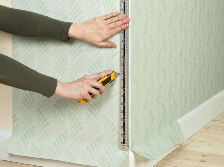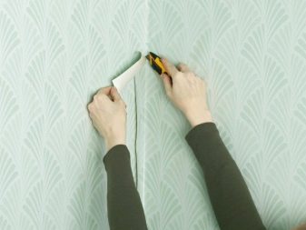 В средата на припокриването се прави разрез. Отместете горната част на тапета, за да премахнете изпъкналите части на платното. След отстраняване залепете горния лист на място.