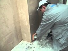 - Бетонни стени трябва да се почисти добре до основата. Старите тапети, вароса, мазилка или боя трябва да бъдат премахнати. Боята се отстранява с разтворител. Варовик или мазилка може да се отмие с мокра гъба или да се изстърже с метална мистрия.