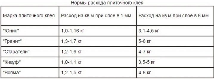 Както бе споменато по -горе, за помещения с различни цели се използват различни видове плочки по отношение на характеристики, материал и качествен състав: за улица, къща и промишлени помещения; под и стена; големи и малки; плочки, керамика, камък, PVC; за баня, кухня, басейн, коридор и др. Помислете за най -популярните марки лепилни смеси и техните норми на потребление.