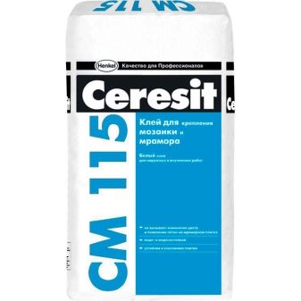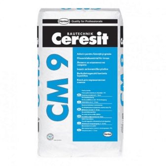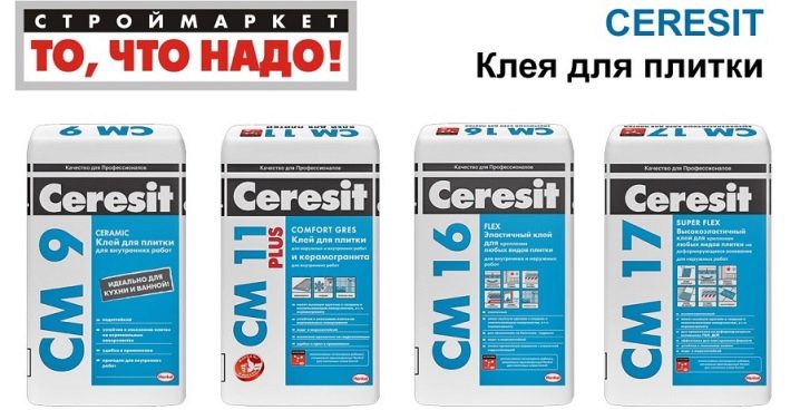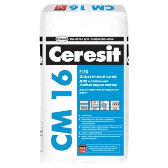 - Ceresit CM-16. Специализираният състав е подходящ за довършване на бани, басейни и тоалетни. Лепилото се използва за монтаж на плочи от мрамор, стъкло, камък, както и продукти от клинкер и плочки. Съставът не се страхува от линейно разширяване на керамични плочки и големи тежести. Поради високата си якост, лепилото може да се използва за оформяне на подови плочки на места с голям трафик на пешеходци.