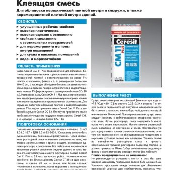 Лепилото Ceresit е предназначено за монтаж на керамични, клинкерни, порцеланови каменни изделия и облицовъчни материали от камък със степен на абсорбция на влага не надвишава 3%. При изливане на замазка за системата “топъл под” се препоръчва да се добави течен еластификатор към състава. Това ще предпази адхезивния слой от напукване по време на редовни цикли на разширяване-свиване, които неизбежно възникват под въздействието на различни температури. Адхезивният състав може да работи при температури от -50 до 70 градуса. Съставите, устойчиви на замръзване, са в състояние да издържат до сто цикъла на замразяване и размразяване без влошаване на работните им свойства.
