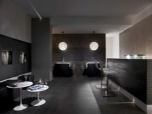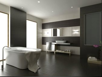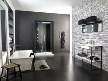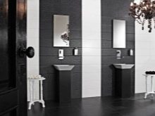 - Черно и бяло. Плочките в черно или бяло са класика, която не излиза от модата. Контрастните пластири работят чудесно заедно, но се използват и поотделно. Банята, изцяло облечена в черно, изглежда шикозно и впечатляващо, тогава тази техника може да се използва само въз основа на просторни стаи..