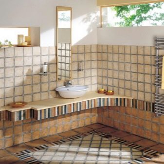 - Етнически стил. За баня в етно стил матовите плочки в кафяви и бежови тонове са чудесни. Те са меки и неутрални нюанси, които са чудесни за жилищни помещения. Също така, дизайнерите препоръчват използването на сиви матрици..