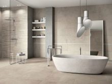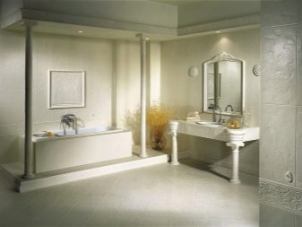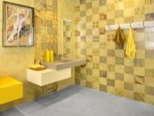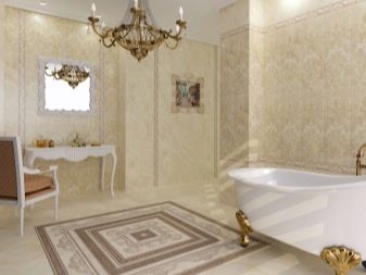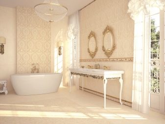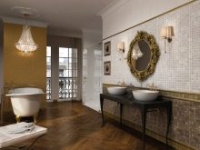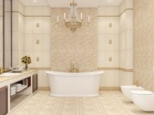- Търсене. На върха на популярността са леките плочки, украсени със златни елементи. Основните използвани цветове са: бяло, бежово, шампанско, империя, мляко и други тонове. Идеален за малки бани. С такава плочка стаята ще изглежда умна и елегантна..