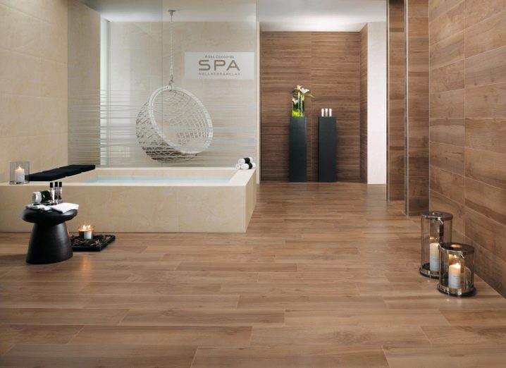 - дърво. Симулираната порода може да бъде разнообразна. Бамбукови плочки са много популярни..