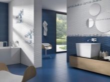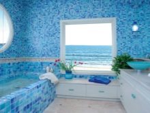 - Морска тема в меко синьо. Матовите плочки в доминиращия цвят бяха допълнени с малки мозайки. Този декор остава актуален от година на година..