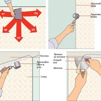 - Повдигнете листа, облегнете горната му част на тавана. Подравнете линията и внимателно притиснете платното към стената отгоре надолу (изгладете тапета с движения на ръцете от центъра на листа до ръбовете му).