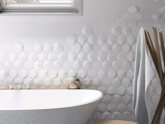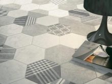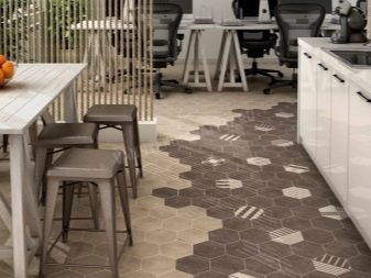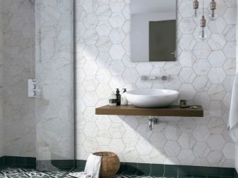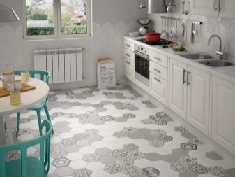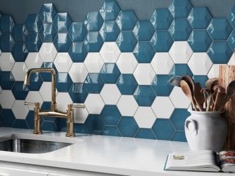 Шестоъгълните керамични плочки имат матова и лъскава повърхност, както и циментов ефект. Има много цветове и орнаменти на самите плочки, а декоративният дизайн на мозайката зарадва дори най -изтънчените критици. С компетентно оформление на самите плочки и бордюри можете да създадете невероятно красив интериор.