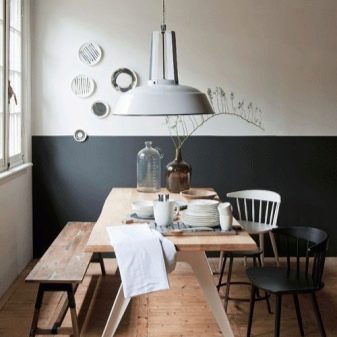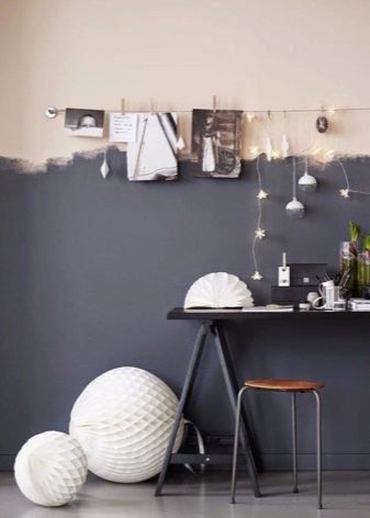 Това е стандартна стайна живопис в два основни тона. В същото време хоризонталното разделяне е популярно. Долната част е боядисана в тъмни или ярки нюанси, а горната, напротив, е по -светла. Така че можете да украсите стените във входа или на балкона.