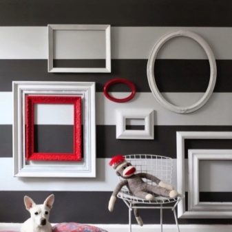 Този дизайн изглежда доста необичаен. По правило тази лента се намира на нивото на очите. В тази област на стената обикновено се окачват фотографии, картини и други декоративни предмети. Обикновено ивицата има по -ярък или по -тъмен нюанс от останалото покритие, което подчертава и подчертава декоративните елементи, разположени по стените.