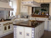 Не трябва да забравяме, че Гжел е самодостатъчен елемент от интериора и неговото неумело използване може да претовари стаята.. Когато използвате плочки в традиционната синьо-бяла цветова схема за Gzhel, тя трябва да бъде не повече от 80% от общата площ на стаята.Аз съм. Тоест, ако някоя част от кухнята (обикновено зоната на престилката) е украсена с плочки Gzhel, тогава останалите повърхности трябва да са светли едноцветни нюанси със спокойна текстура. Моля, обърнете внимание, че кухненският модул може да е бял или син..