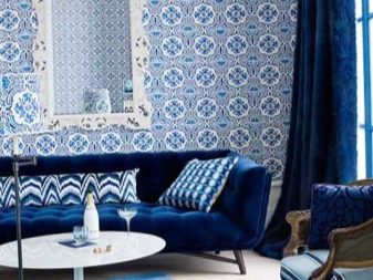 Комбинирането на плочки Gzhel с други модели ще помогне да се избегне скуката и монотонността. – малък грах, клетки, ивици. Добре е, ако рисунките ще присъстват върху тапицерията на мебели, текстил, аксесоари, съдове.