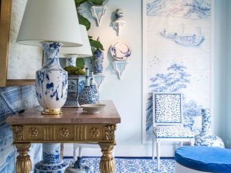 Гжелските мотиви изглеждат най-добре на добре осветени повърхности. Въпреки това, дори ако следвате тази препоръка, излишното синьо може да направи стаята студена и неудобна. В тъмни помещения синьото трябва да се използва в дозировка..