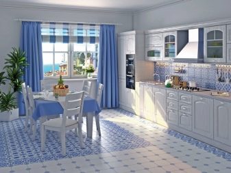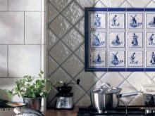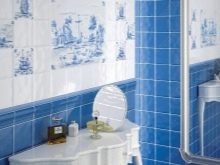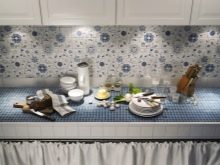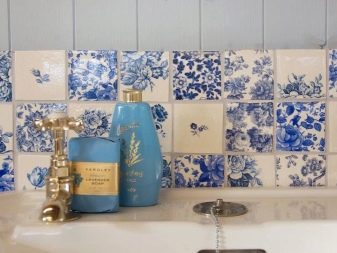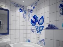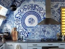 - Ако имате деликатен вкус, комбинирайте плочки с наситено синьо, добавяйки акценти и декор в темата Gzhel.