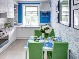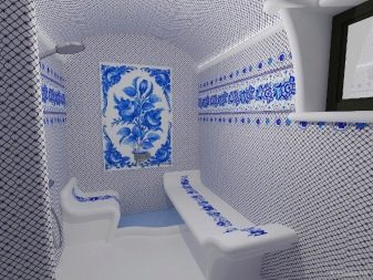 При избора на плочки по техниката на Gzhel трябва да се помни, че те са доста активни “герои” на интериора, така че те трябва да се използват в ограничени количества, като внимателно се избират спътници.