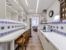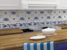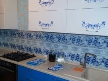 Не трябва да забравяме, че Гжел е самодостатъчен елемент от интериора и неговото неумело използване може да претовари стаята.. Когато използвате плочки в традиционната синьо-бяла цветова схема за Gzhel, тя трябва да бъде не повече от 80% от общата площ на стаята.Аз съм. Тоест, ако някоя част от кухнята (обикновено зоната на престилката) е украсена с плочки Gzhel, тогава останалите повърхности трябва да са светли едноцветни нюанси със спокойна текстура. Моля, обърнете внимание, че кухненският модул може да е бял или син..