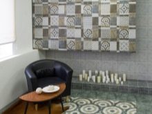 Предлага се продуктите със стандартни размери да се поставят във вертикална посока. Колекцията включва четири варианта на подови плочки 40 × 40 см, от които можете също да подредите шаблона в произволен ред, включително шахматна дъска.