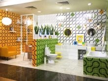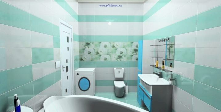 Ефектът на свежест, морски бриз и ефирност се създава, използвайки ментовия нюанс на плочките и флоралната тема на декора. Тюркоазеното покритие на мебелите допълва картината..