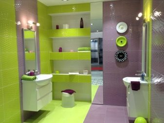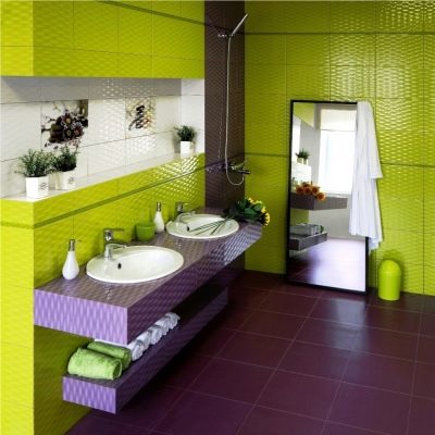 За необикновени и ярки личности комбинацията от ярки шам фъстък и лилаво в интериора на банята може да бъде действително и неочаквано решение. Бялата вложка успокоява и балансира голямата картина.