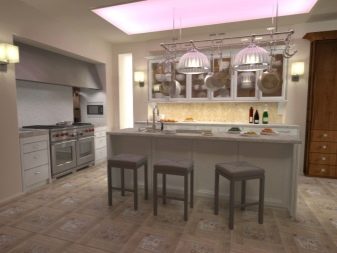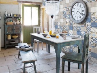 Втората най -популярна стая, където се използва този довършителен материал, е кухнята. Тук плочките обикновено се подрязват с престилка близо до масата за рязане. Често върху пода се полагат и плочки, тъй като е доста лесно да се премахне мръсотията от такова подово покритие, а в кухнята е толкова лесно, колкото да се обелят круши, за да се оцвети.