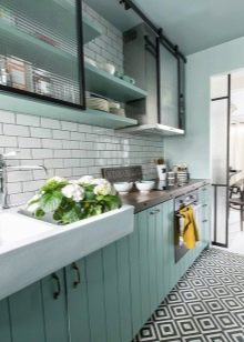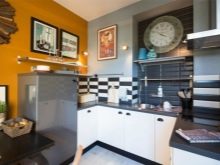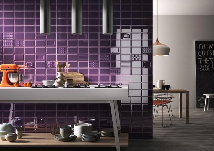 Ярките и лъскави плочки с декоративни вложки ще изглеждат смели в модерна кухня. Монохроматично боядисани стени с контрастен и спокоен нюанс тук благоприятно подчертават част от стената, изработена от такива плочки. Стаята може да бъде допълнена с голяма графична дъска за рисуване, мебели от естествено дърво в стила на минимализма, интересни столове с необичайни облегалки, ярки възглавници.