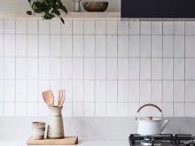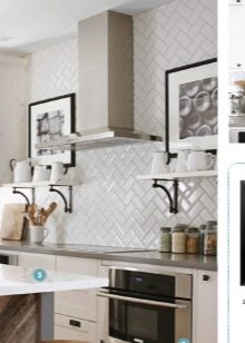 Ако говорим за кухненска престилка, тогава има още възможности. Бялото „прасе“ от рибена кост ще върви добре с монохромни предмети – вази, кани, прибори за хранене. Бял комплект и сив плот без шарка перфектно ще допълнят картината..