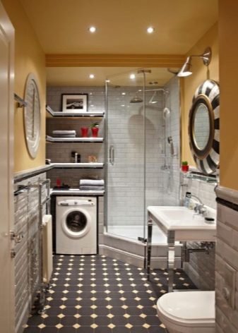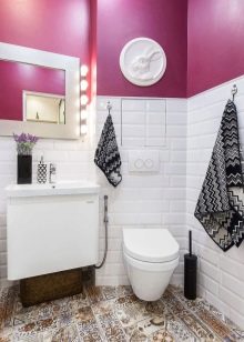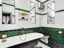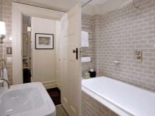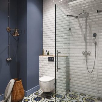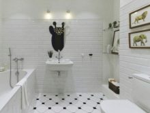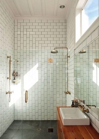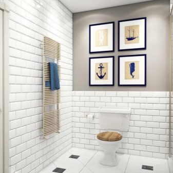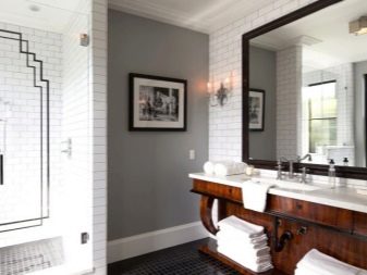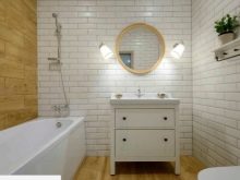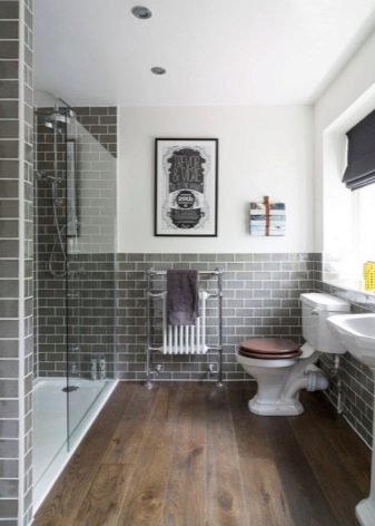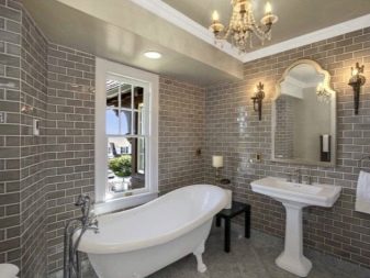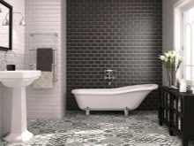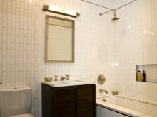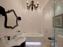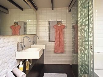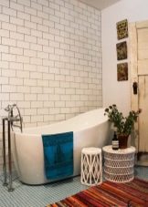 Например баня и тоалетна в стил таванско помещение предполага наличието на тухлена зидария, бетонни повърхности, голи метални тръби. Бяло “свине” без скоси, изложено по прост начин с отместване, ще изглежда добре с контрастни, тъмни шевове. Малка мивка, ламаринен плот и железни крачета ще допълнят интериора компетентно. По -добре е да изберете обикновена стоманена вана и да направите кутия под нея, облицована със същите плочки.