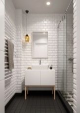 Ако такива интериорни опции не са за вас, тогава можете да използвате плочки в два контрастни цвята и с модел в модерна баня: поставете стените с прасе от бели и сини нюанси, където горната част ще бъде бяла, а долната ще бъдете сини, използвайте модерни форми на водопровод и интересни лампи на кабели.
