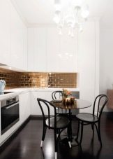Класическа кухня без декораторски деликатеси също може да бъде украсена с „глиган“. Тук престилка, изработена от дълги матови тухли с бежови нюанси, перфектно ще освежи строг и аристократичен интериор..